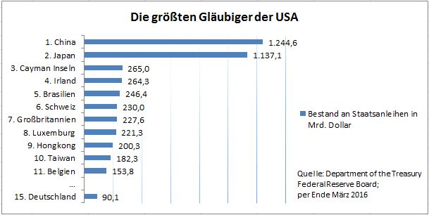 Die mit Abstand größten Gläubiger der USA sind China und Japan mit über einer Billion USD, wie aus folgender Grafik (Quelle) zu ersehen ist. Erstaunlich, dass so kleine Länder wie Irland, die Schweiz und Luxemburg zu den Top 10 gehören.